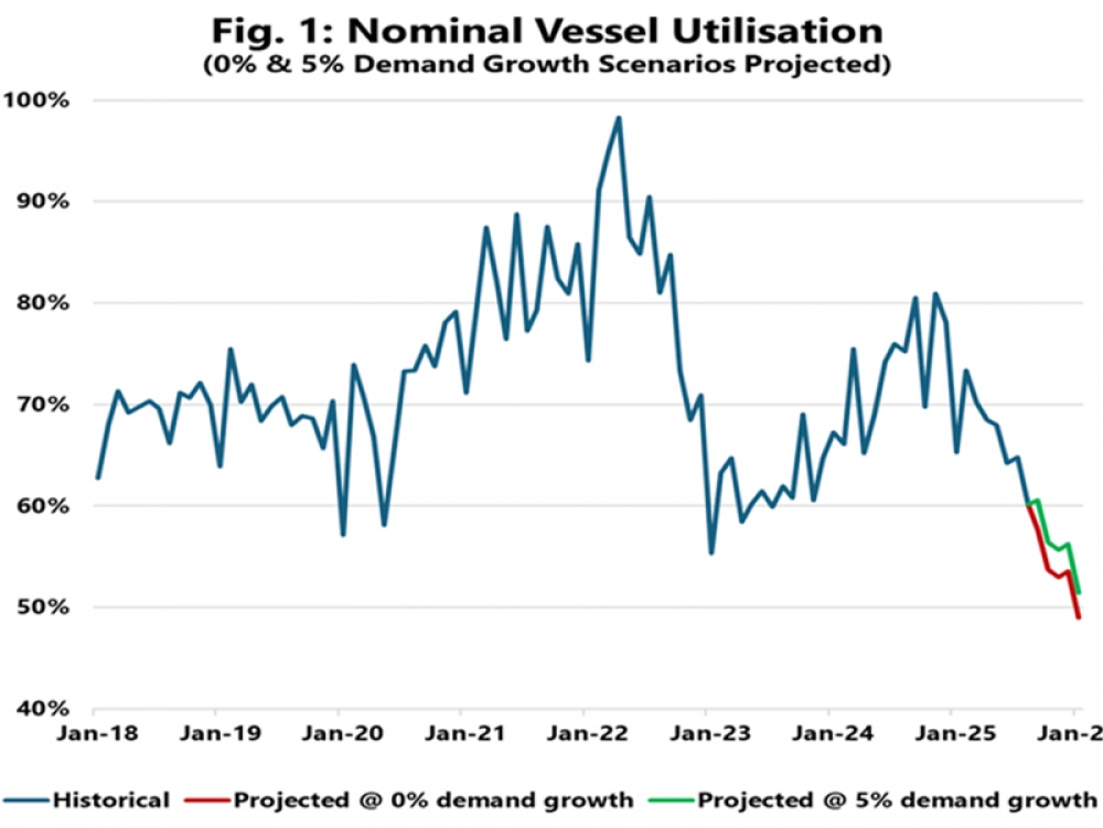 Para evaluar ese impacto, Sea-Intelligence calculó la utilización nominal de naves usando datos históricos de demanda y oferta, proyectándolos bajo dos escenarios: crecimiento de demanda de 0% y un escenario optimista de 5%. Según el reporte, incluso el escenario de demanda plana. En ambos casos, la utilización proyectada de naves se desploma a niveles históricamente bajos, “muy por debajo del periodo normal pre-pandemia de 2018-2019”.
