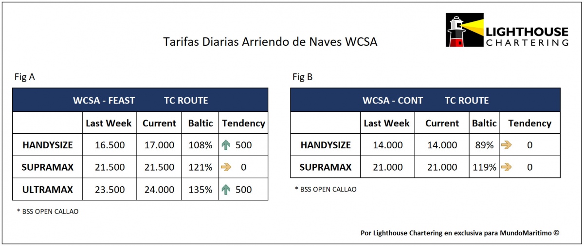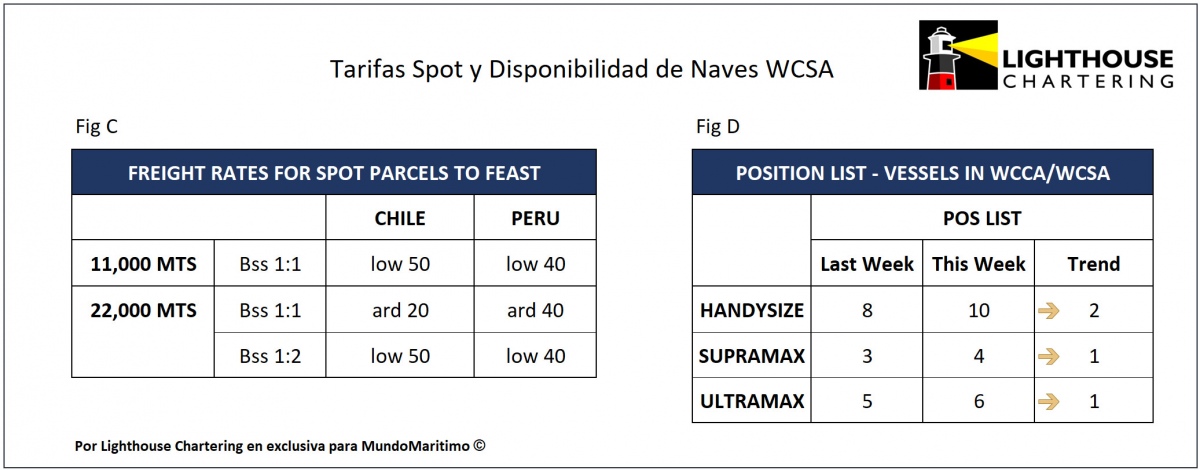 Cabe recordar que los datos de este informe estadístico fueron elaborados por el departamento de investigación de Lighthouse Chartering, que MundoMaritimo difunde semanalmente como parte de una alianza exclusiva. Puede contactarnos para informes especializados con información estadística detallada y actualizada sobre el desempeño de las tarifas de transporte marítimo de graneles a la Costa Oeste de Sudamérica. Principales antecedentes en [email protected].