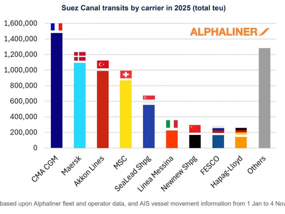 Durante los primeros diez meses de 2025, CMA CGM lideró el uso del Canal de Suez por capacidad nominal, seguida de Maersk, que solo ha realizado tránsitos regionales entre Tanger Med, Port Said y Jeddah, evitando el estrecho de Bab el-Mandeb. Entre las diez líneas navieras más grandes del mundo, solo MSC y Hapag-Lloyd registraron actividad en la vía egipcia, mientras que COSCO, ONE, Evergreen, HMM y Yang Mingno realizaron ningún cruce.