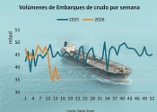 “Desde el inicio de la guerra con Irán, los embarques globales de crudo han caído un 16% en comparación con las primeras nueve semanas de 2026, según datos de Signal Ocean. Esto representa una reducción de 7,6 millones de barriles por día (mbpd), hasta 38,4 mbpd. Coincidentemente, los envíos durante las últimas seis semanas también han sido un 16% inferiores al mismo periodo del año pasado”, señala Niels Rasmussen, analista jefe de transporte marítimo de BIMCO.