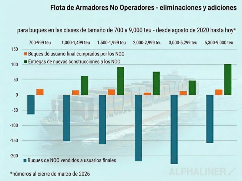 En el último año móvil a marzo de 2026, los NOO vendieron 130 buques —equivalentes a unos 380.000 TEUs— a usuarios finales, principalmente líneas navieras. Esta dinámica se mantiene como la principal causa de la contracción de la flota, aunque por debajo de los niveles del período previo, cuando se registraron 168 ventas por 633.000 TEUs.