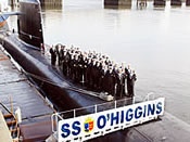 Sobre la cubierta del submarino SS-1 "O'Higgins", el primero de los dos submarinos Scorpene que el consorcio hispano-francés Izar-DCN construye para nuestro país, aparece el comandante en jefe de la Armada, almiranteMiguel Angel Vergara Villalobos, posando con la dotación del sumergible, que integran seis oficiales, ocho suboficiales y 18 marineros, bajo el mando del capitán de fragata Rodrigo González Reyes.
