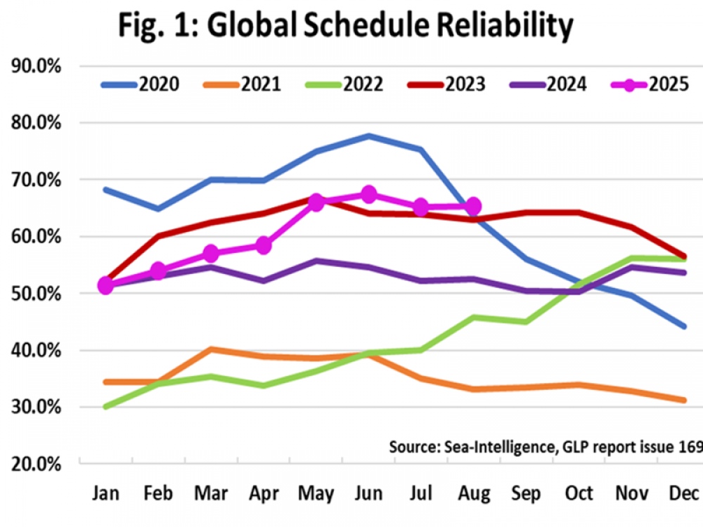 En agosto de 2025, la confiabilidad global de itinerarios registró una leve mejora mensual de 0,1 puntos porcentuales, alcanzando el 65,3% (imagen abajo), el segundo valor más alto para este mes (en el período 2019-2025). En la comparación interanual, la confiabilidad en agosto de 2025 subió 12,7 puntos porcentuales. El retraso promedio de las recaladas tardías de buques aumentó 0,07 días respecto al mes anterior, llegando a 4,80 días, según el Global Liner Performance (GLP) de SEA-Intelligence.