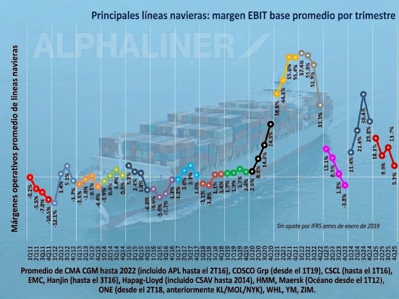 26 de Marzo de 2026 Margen operativo promedio de las líneas navieras cae a 5,3% en el cuarto trimestre de 2025 Aún así, las ganancias operativas se mantuvieron muy por encima de la década previa al Covid-19
