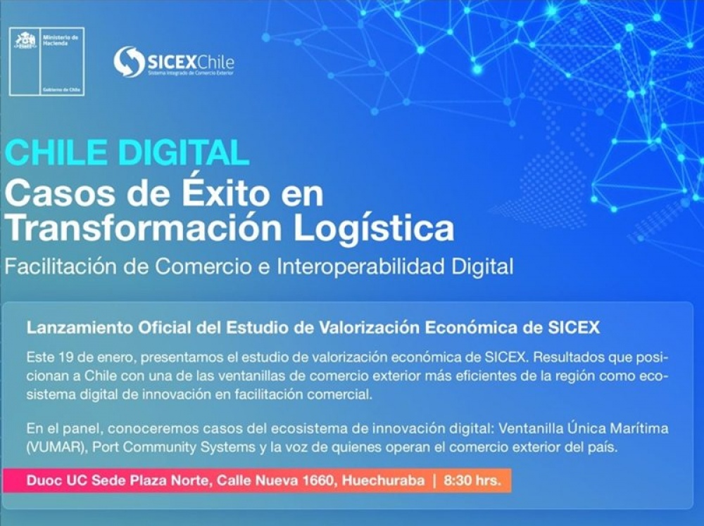 El Ministerio de Hacienda, junto a Conecta Logística y DUOC UC, realizará el próximo 19 de enero la presentación oficial del estudio de valorización económica de SICEX, en el marco del encuentro “Chile Digital: Casos de Éxito en Transformación Logística”, que tendrá lugar en DUOC Plaza Norte, en Santiago. La actividad reunirá a representantes del sector público, privado y académico para analizar los avances de Chile en integración tecnológica aplicada al comercio exterior.