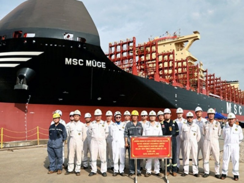 Poco después de la entrega de sus buques gemelos, el “MSC Gabriella” y el “MSC Muge” (en la imagen), el nuevo portacontenedores es el séptimo de una serie de diez buques gemelos de combustible dual GNL que el astillero chino entregará a MSC en 2025 y este año.