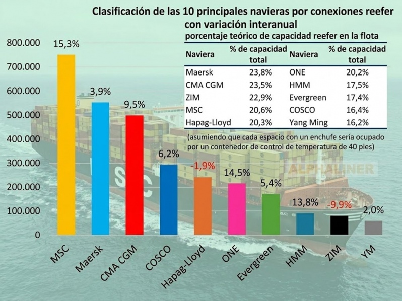 El ranking de capacidad reefer sigue en general el tamaño total de las flotas, con la excepción de ZIM, que pese a ser la décima mayor línea naviera del mundo, ocupa el noveno lugar en este segmento. La compañía israelí registró una caída del 10,1% en su capacidad total, lo que también impactó en una reducción del 9,9% en su capacidad reefer.