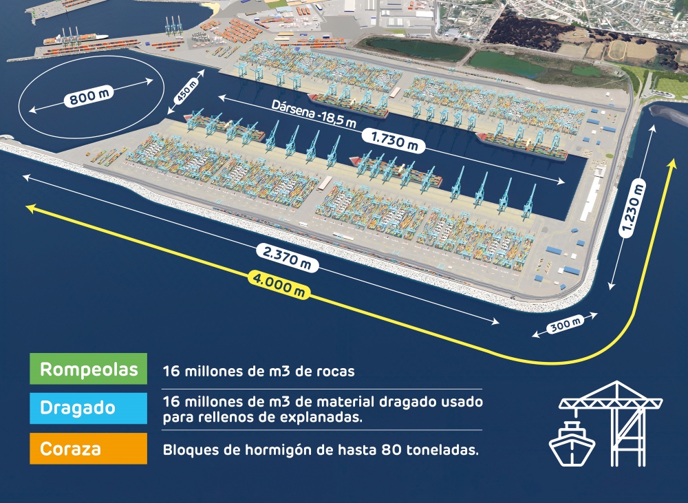 Puerto Exterior contempla la construcción de un molo de abrigo o muro rompeolas de casi 4 kilómetros de longitud, que tendrá dos terminales semiautomatizados de 1.730 metros cada uno, con capacidad para recibir, en forma simultánea, hasta ocho buques de 400 metros de largo, los de mayor tamaño que hoy navegan en el mundo.